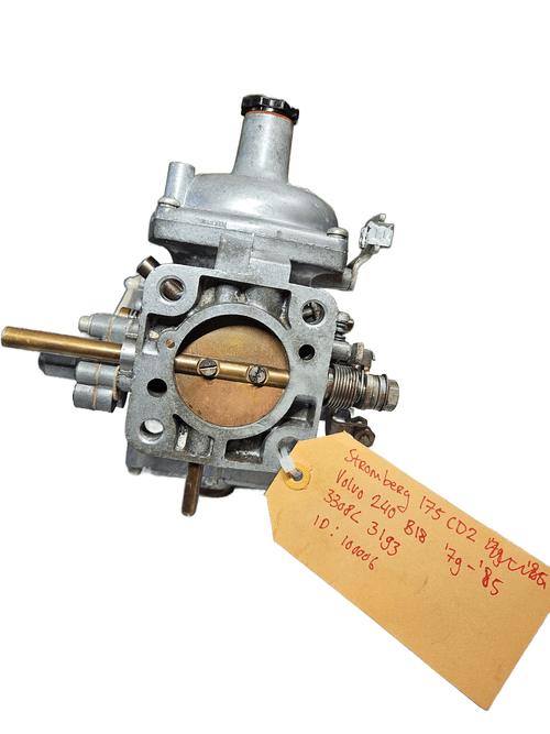 Original Stromberg 175 CD2 carburetor, tag number 3308 3183, used on select Volvo 240 models equipped with the B19A engine in the late 1970s and early 1980s.